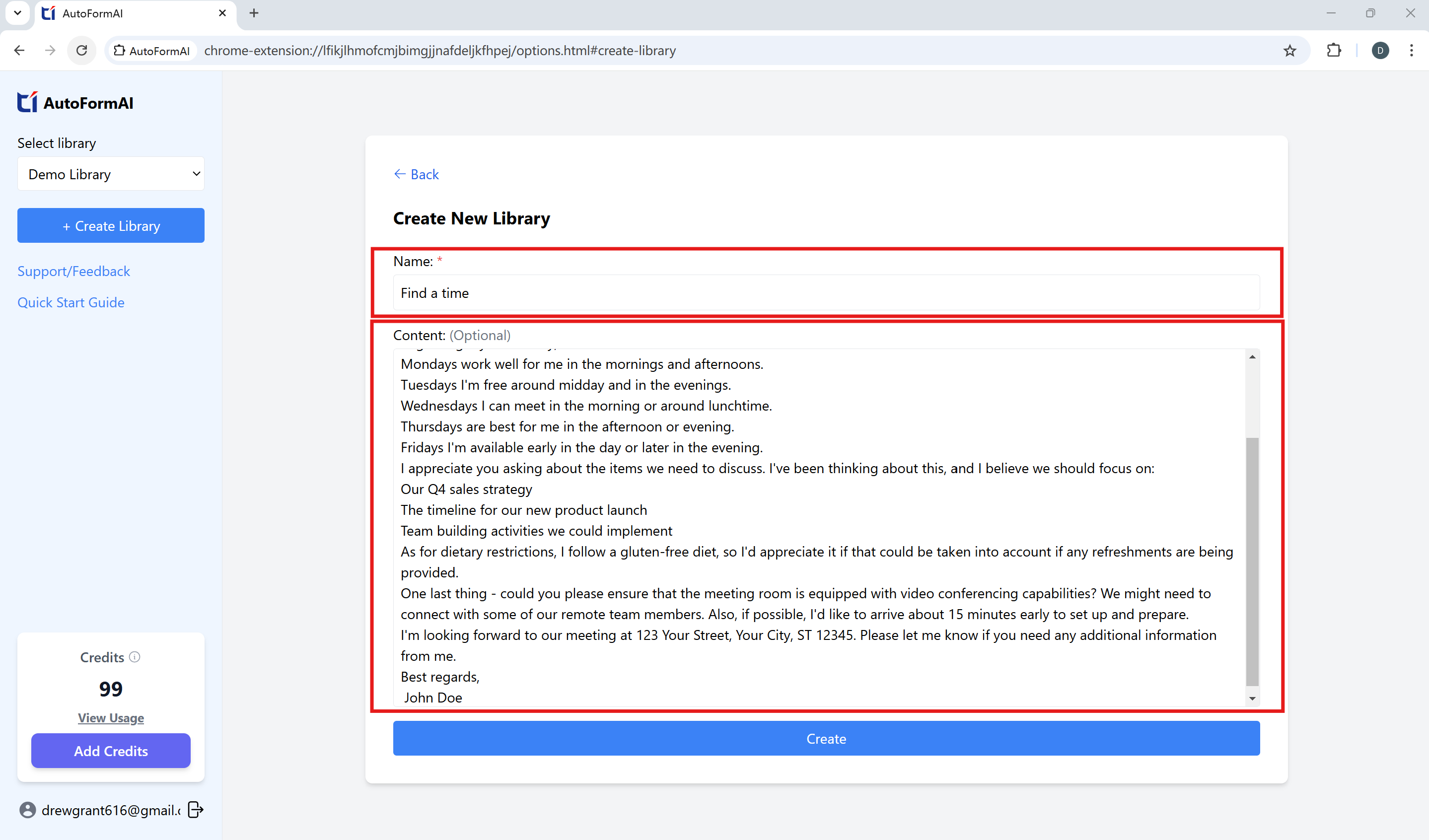 - Hit “Create” to save your library. You can create libraries from any text source—not just emails! 📝