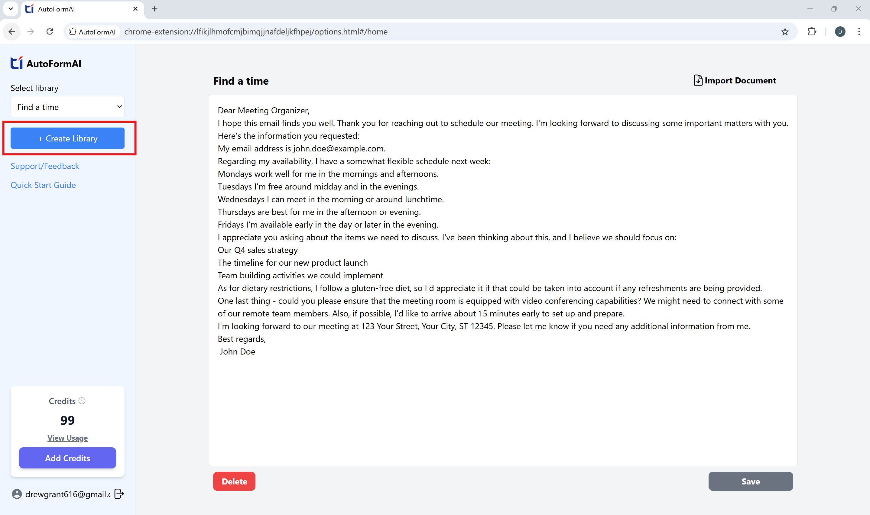 - After logging in, you’ll land on the AutoFormAI options page. This is where you can manage libraries, check credits, and more.